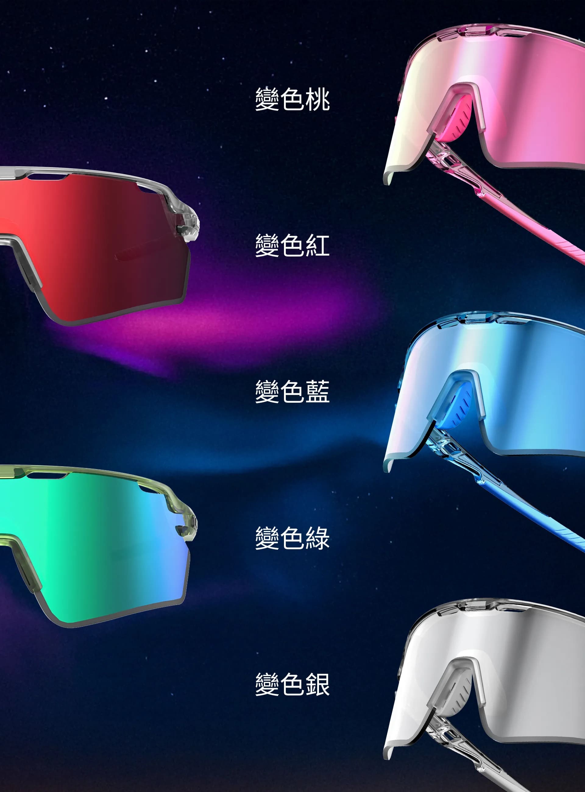 Night Walker 搭載鏡框+鏡片雙變色設計,隨光轉變,隨行進化。不論城市疾走或山林冒險,都能帥氣護眼、輕盈出發。