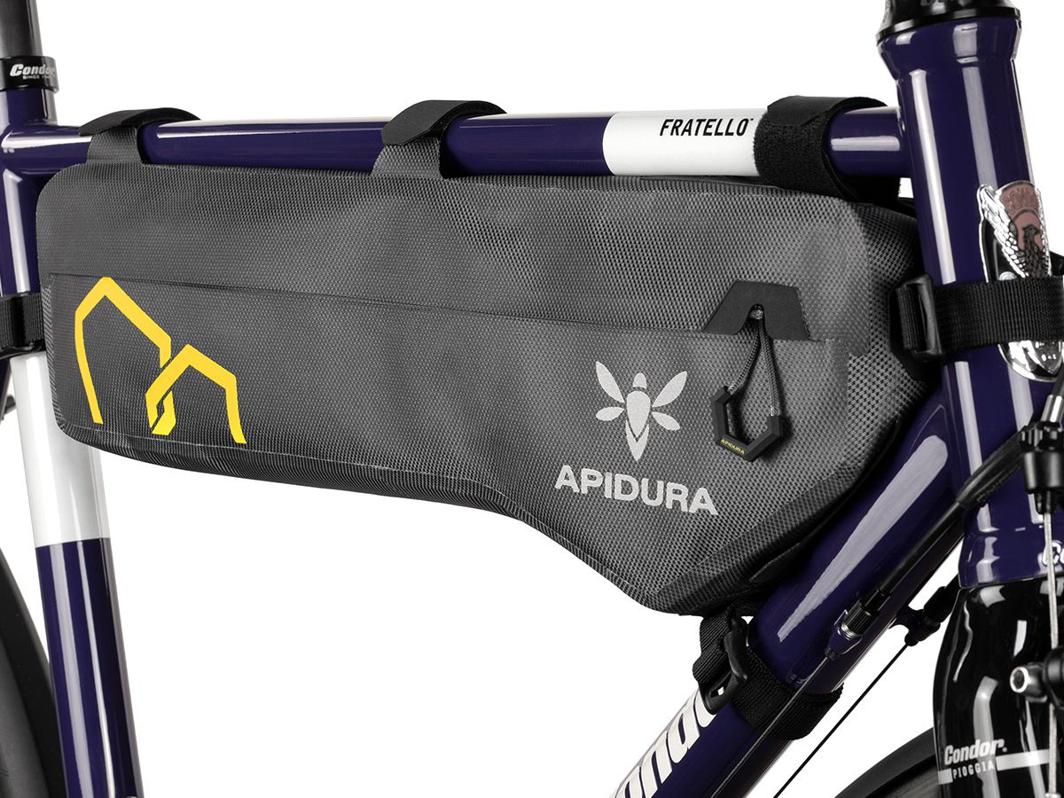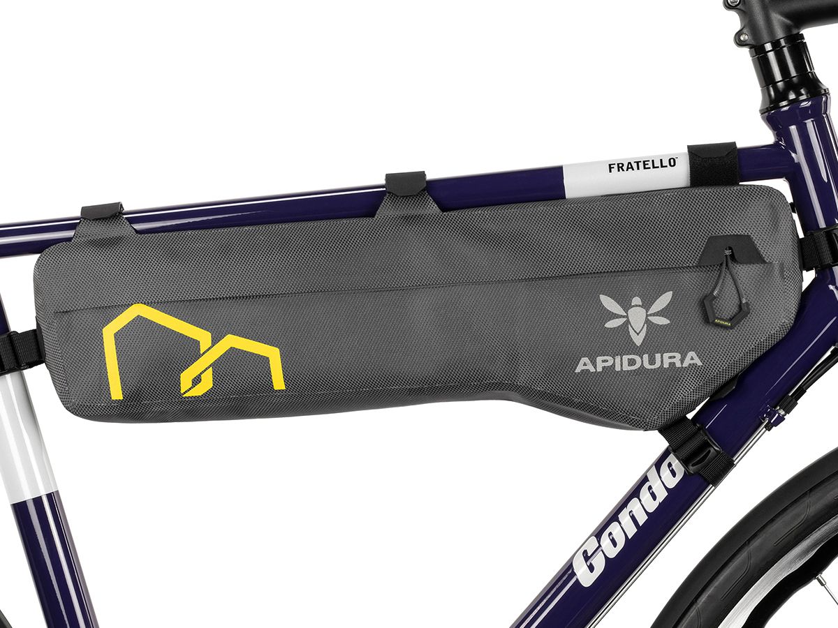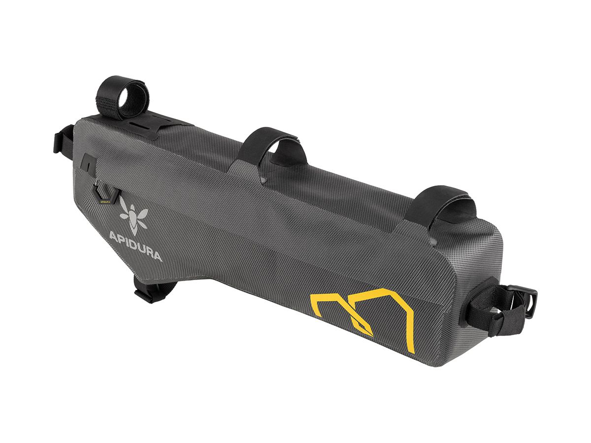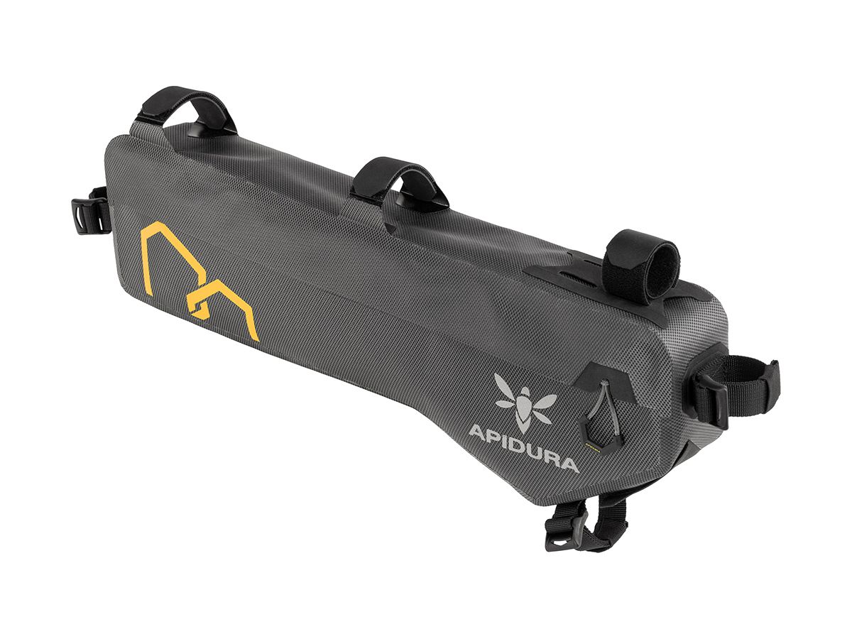 Apidura Expedition 防水車架包安裝在車架中央的車架包,是較能負重的包款,可以放入較重的裝備如營柱、工具或是充電器,這樣的配置也可以保持車子的重心位於中間。多孔位綁帶配置讓您可以隨心所欲調整綁帶位置。