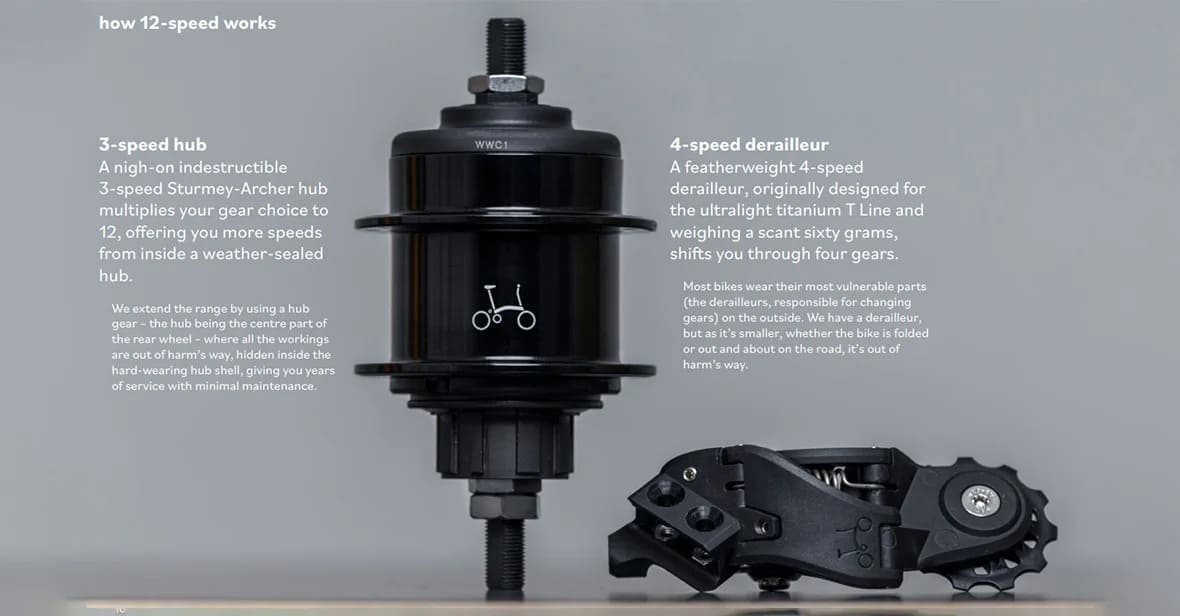 我們的 12 速變速系統提供與公路車、混合車、通勤車或城市車相同,甚至更多的齒比範圍,同時保有 Brompton 折疊車的便利性:輕量、便攜、可折疊。