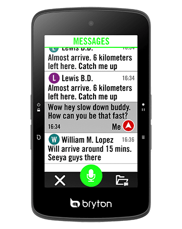 需要呼叫團騎的夥伴、通知休息點,或是純粹想和隊友互相加油打氣嗎?透過Rider S800和Bryton Active App,你可以快速且安全的透過團體群聊功能傳送訊息給群組內的夥伴,你可以事先在Bryton Active App上建立預設訊息並在碼錶上快速傳送,也可以在休息時利用Bryton Active App直接以手機輸入訊息。此外,更可以在騎乘時直接透過語音辨識功能於碼錶上輸入客製化訊息!