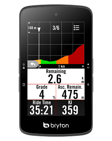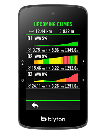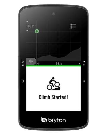 無論是要挑戰自我或是訓練與競賽,Rider S800全新的Climb Challenge坡段資訊功能都能帶你達到騎乘的新高度!只要匯入路線至Bryton Active App,Bryton將會自動建立其中的坡段資訊,按照規劃路線騎乘時,Rider S800會在坡段開始前提供即將到來的爬坡資訊,包含圖像式的坡段資訊顯示、以顏色區隔不同坡度、坡段距離、海拔、爬升,以及坡段起始點等,提供使用者一目了然的坡段資訊。