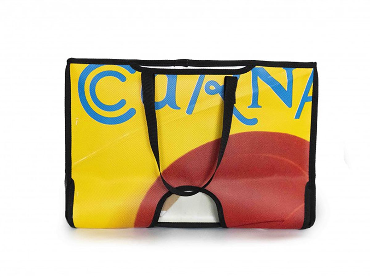 經過材料收集,對其進行清潔。我們將回收的原材料「廣告帆布」剝離它之前的用途,幫助它轉化為新的材料元素。