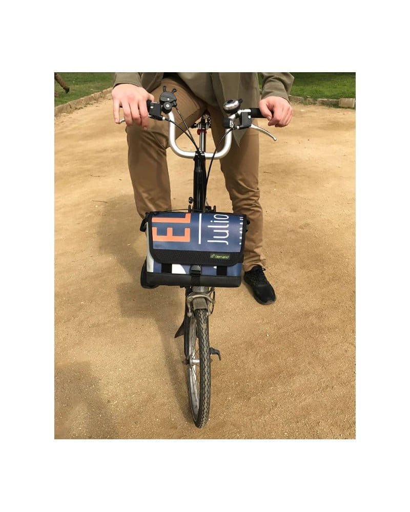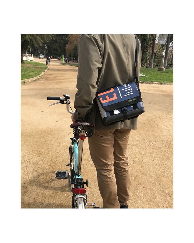 RIBERA 迷你包完全防水,採用巴塞隆納的回收材料製成。 它非常適合您在城市中的日常活動。 它的設計便於您掛在 Brompton 自行車上或掛在肩上。