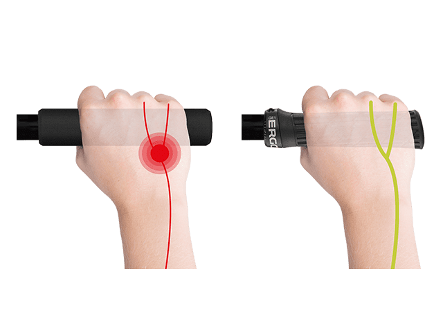 GE1內部具軟的橡膠,呈淚滴形狀的拇指區域。握把向外緣擴張,以實現更好的壓力分佈。紋理延伸到握把的末端,保護壓力敏感的尺神經不被壓縮。在這個區域內更好的壓力分佈有助於防止常見的神經問題,如刺痛、不適和麻木。