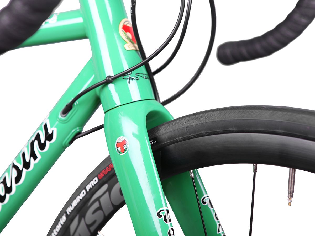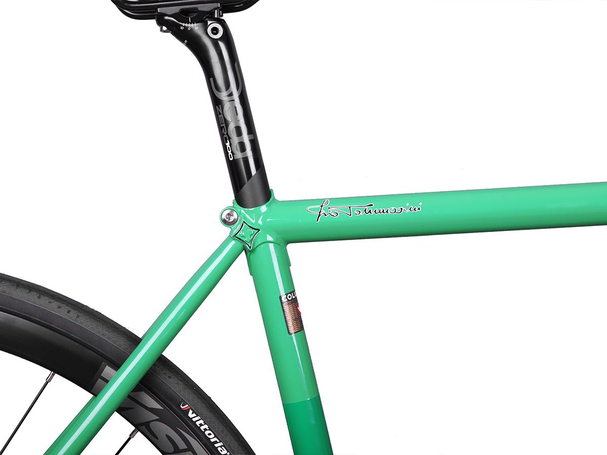 FIRE車架是根據 Irio Tommasini 設計的獨特幾何形狀所打造的。FIRE是整車架完全經過鍍鉻處理,或是可選擇“cataforesi” 電泳ED處理,非常適合極細的剛管管材,因為它可以深度保護車架免受鏽蝕。精緻工藝另外一個細節就是Tommasini 每個車款都具備的就是釬焊在頭管上手工打造的金屬頭標。