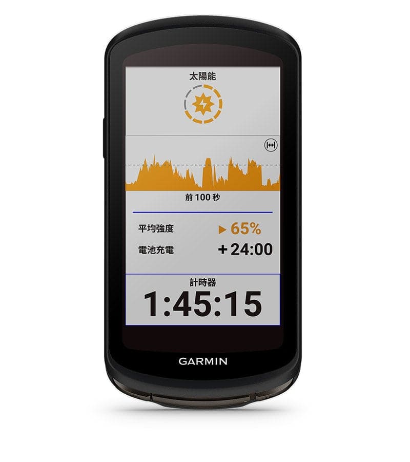 Power Glass 太陽能充電鏡面延長電池效能,在省電模式下提供 100 小時的電池續航,一般模式下,電池效能則可達 45 小時。日間騎乘時,Edge 1040 Solar 在省電模式下可於每小時使用中延長電池效能 42 分鐘,並於一般模式下每小時延長20分鐘電池續航。