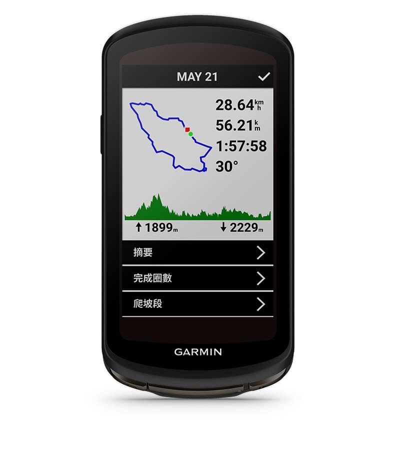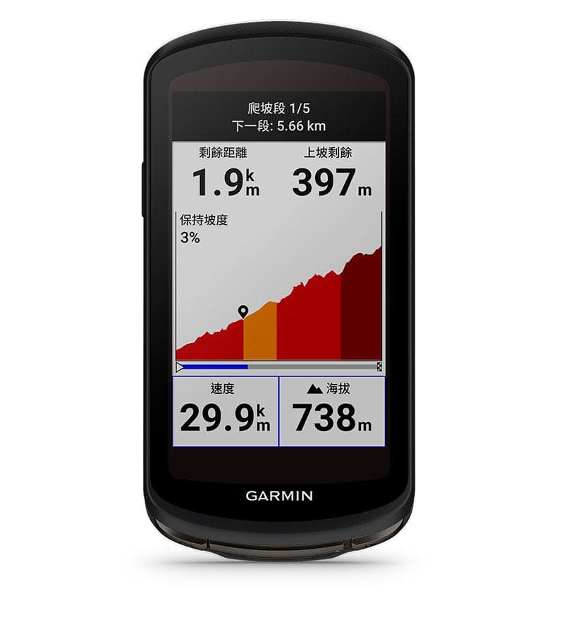 當您沿著預先規劃的路線爬坡時,它會自動顯示剩餘的爬升落差和坡度。 這項功能幫助您衡量您的出力程度並讓您知道還有多少難關要過。 您甚至能儲存您的爬升資訊,在每次騎乘挑戰後,直接裝置上或透過 Garmin Connect app 檢視紀錄。
