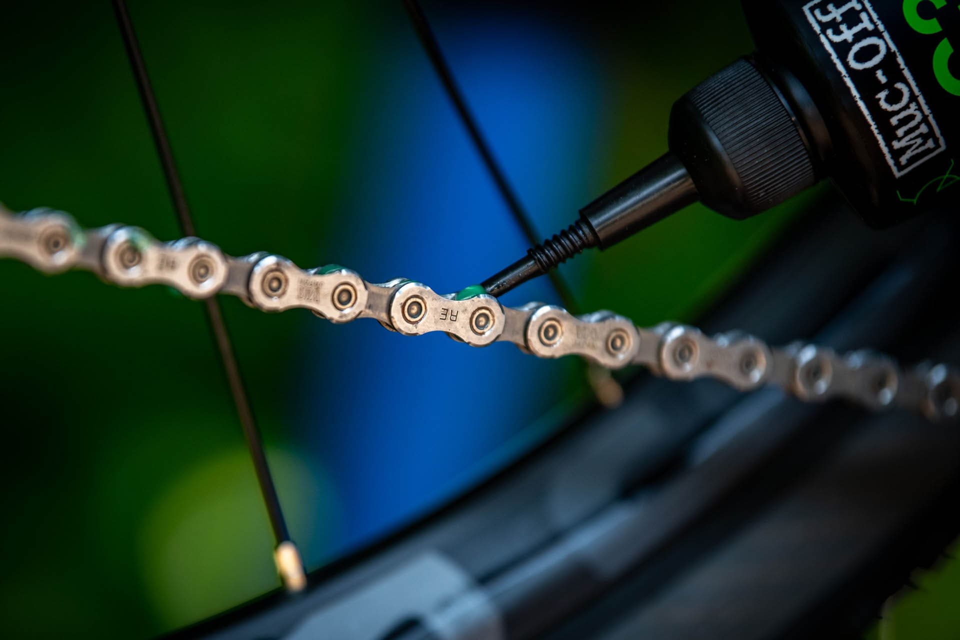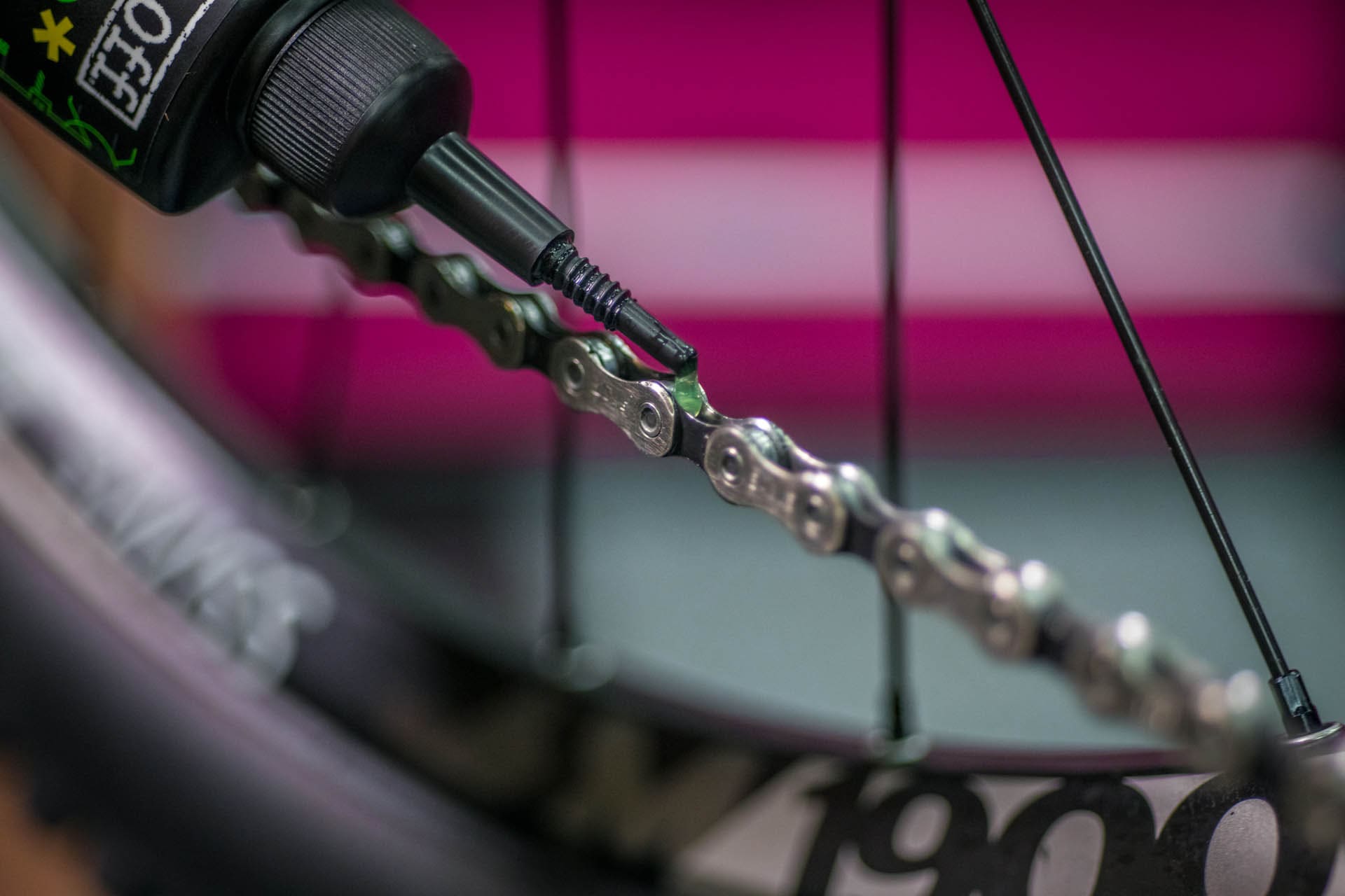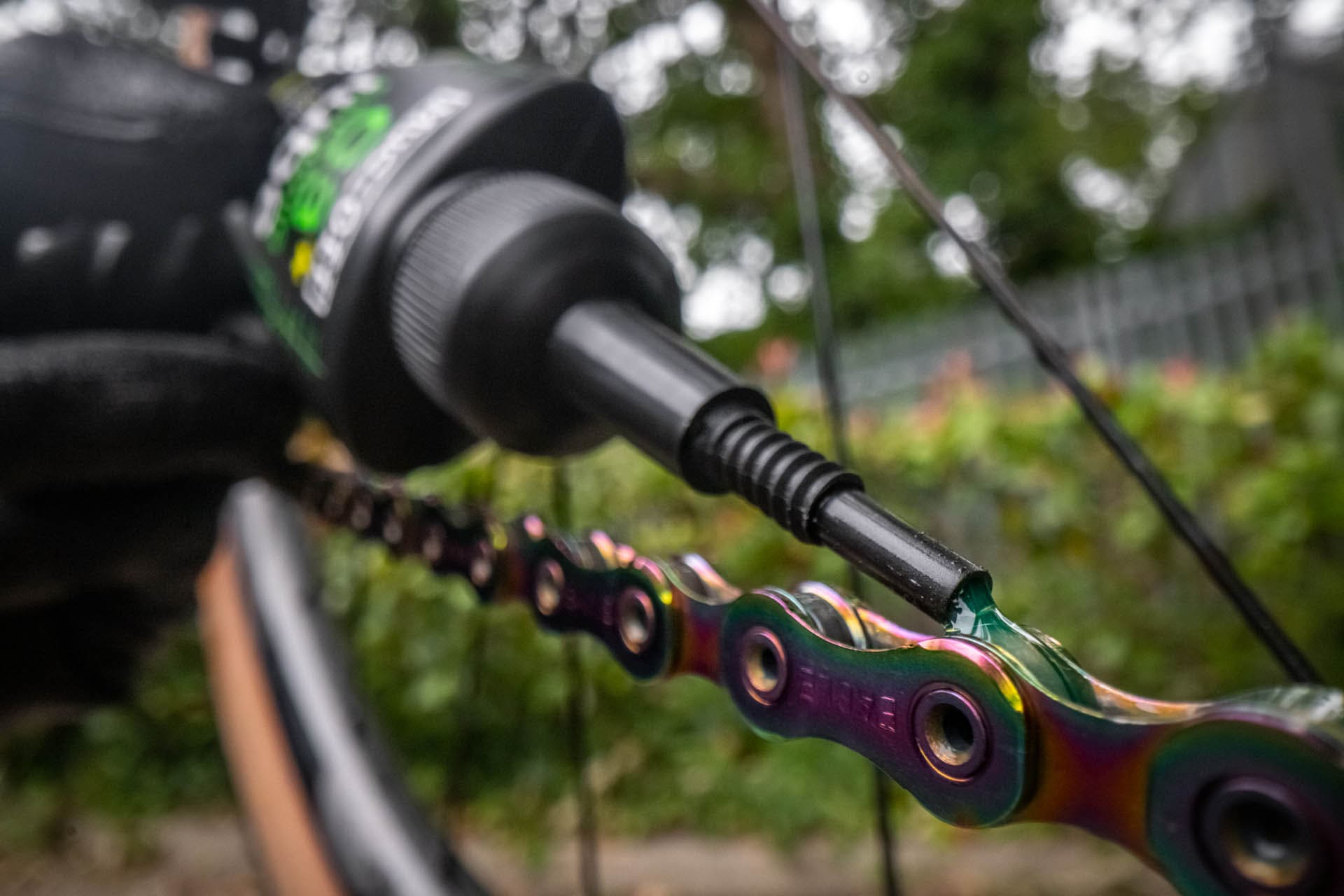 - 洗淨並風乾鍊條後,反向轉動鍊條並擠壓瓶身將鍊條油塗於鍊條上,靜置一段時間後將過多的鍊條油擦拭乾淨