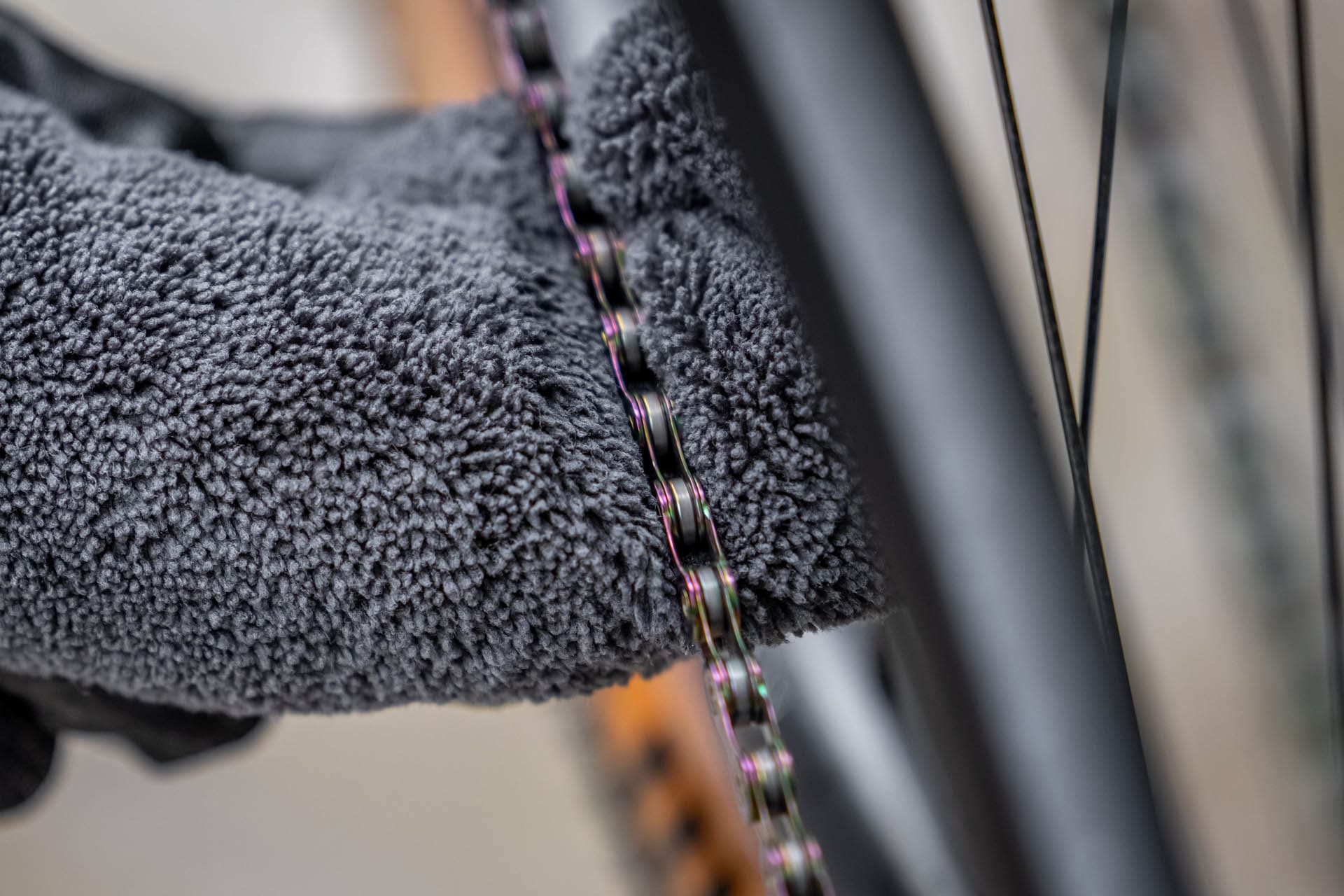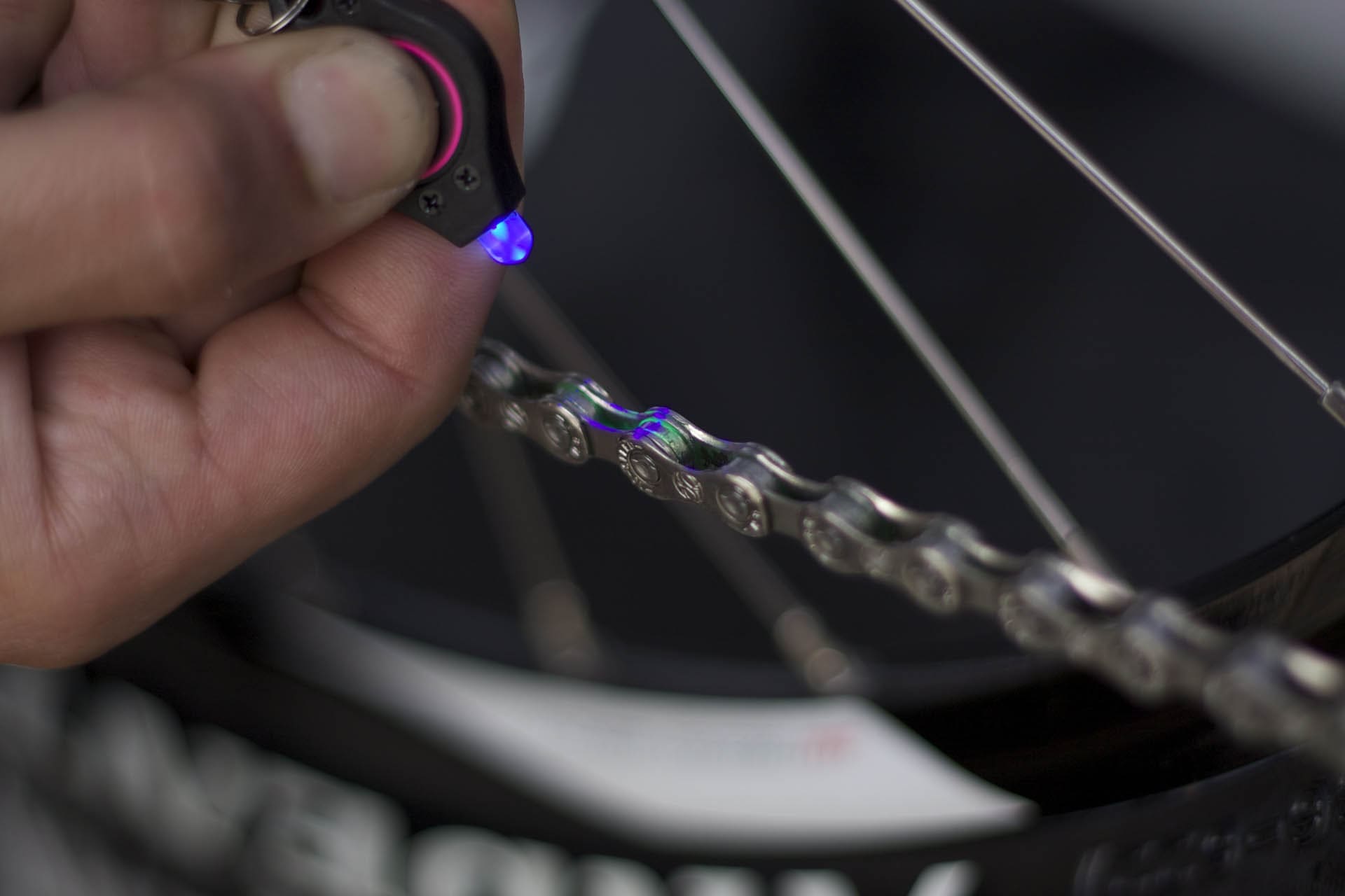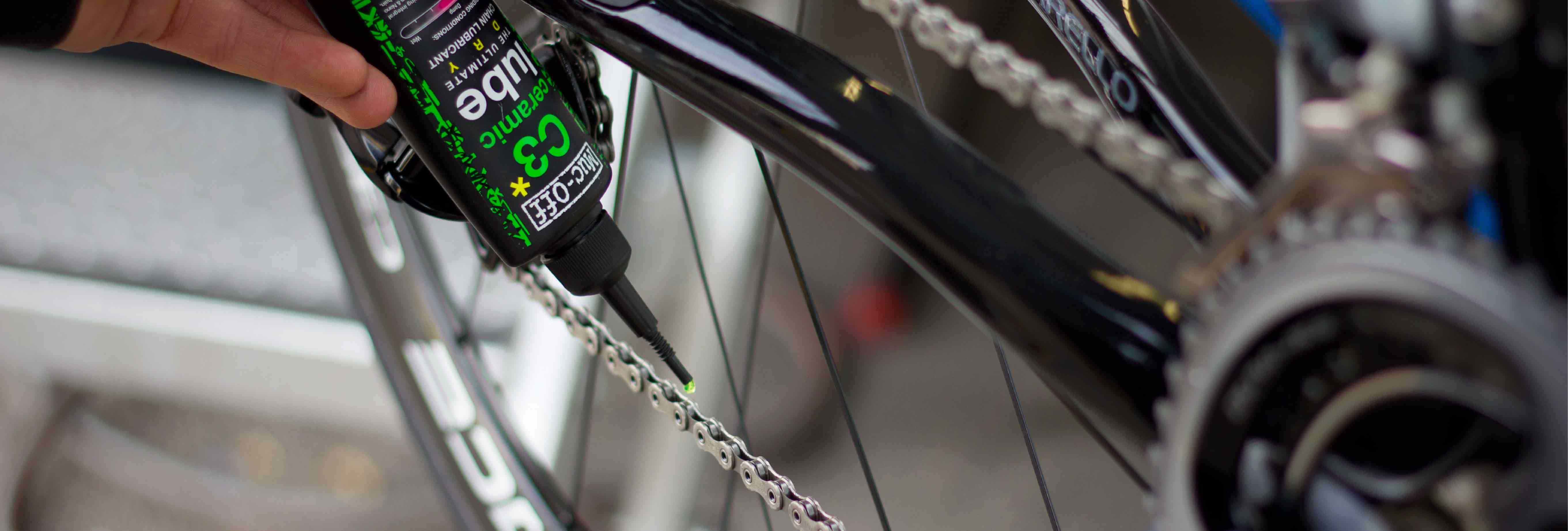 - 洗淨並風乾鍊條後,反向轉動鍊條並擠壓瓶身將鍊條油塗於鍊條上,靜置一段時間後將過多的鍊條油擦拭乾淨