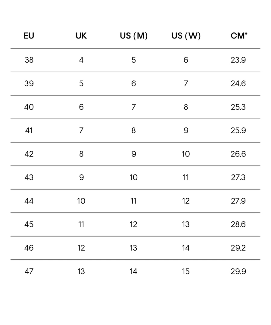*CM 此測量值是鞋的內部長度,我們建議您的腳測量值至少增加 5 毫米,以便鞋子前方保留舒適的空間。