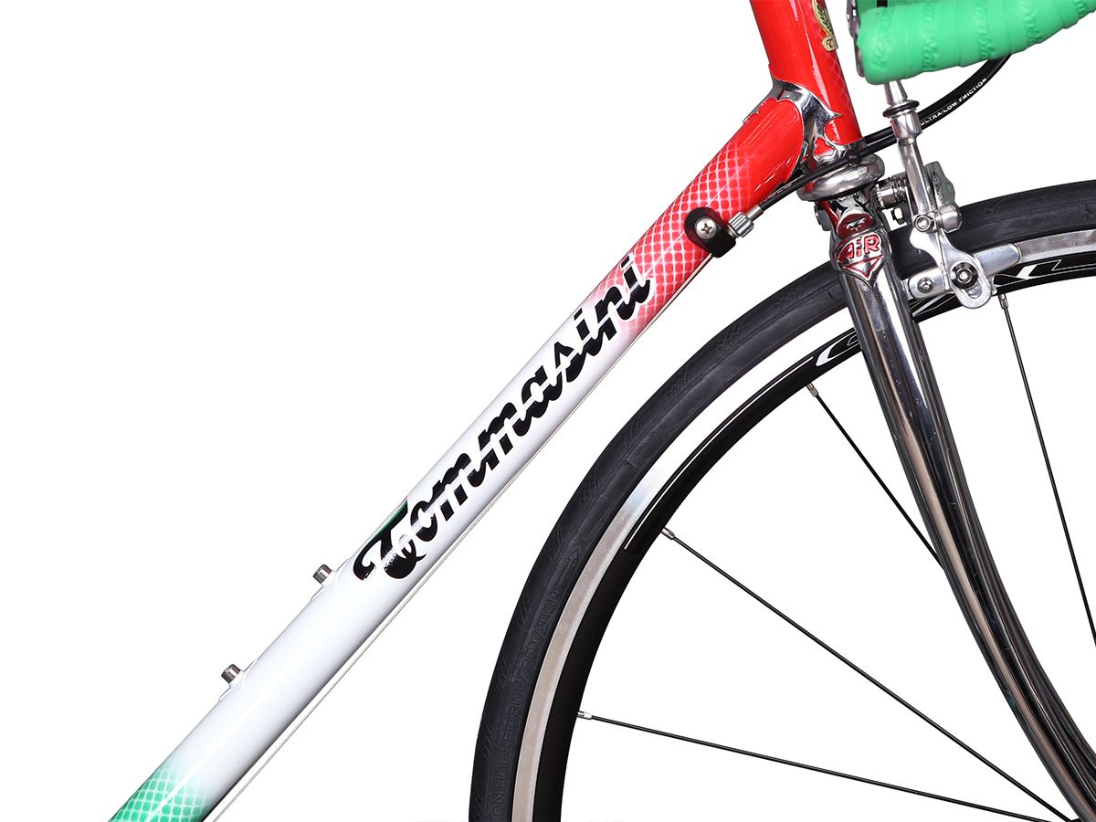 成車/ Tommasini/ TECNO/ Campy套件/ CENTAUR 2x11SPD / 電鍍前叉/ Tommasini Logo 座墊 顏色:義大利國旗色 / 黑色Logo 一吋有牙龍頭 QUILL STEM 不含踏板 / 水壺架