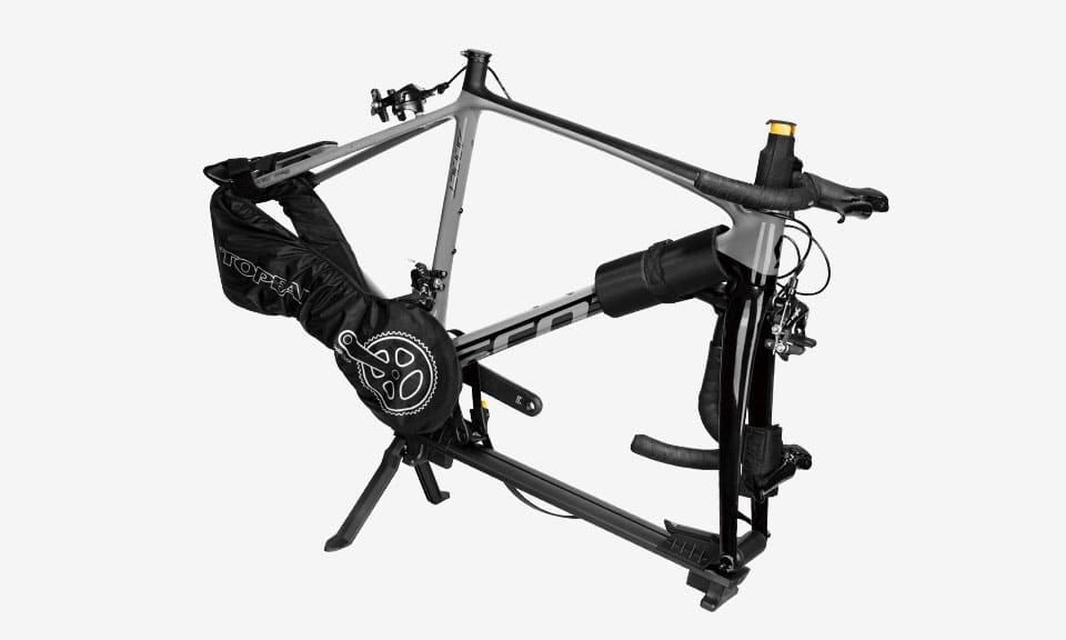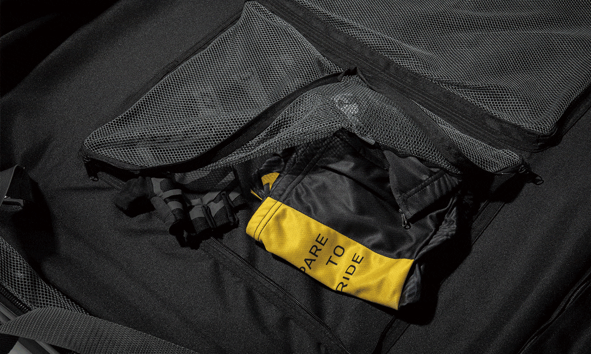 解決自行車打包困擾的攜帶系統,100% PC 與鋁合金箱體兼具輕量化(12.5kg)、移動靈活和堅硬外殼設計。採用60mm 大型四向輪讓移動更加輕鬆便利,雙向提把方便提取,同時採用TSA 海關鎖符合美國海關規範。隨箱附有兩個輪袋、鏈條防汙罩與後下叉保護管避免運送過程金屬物件傷及車架,並且有兩個工具收納口袋可以將打氣筒、工具等小物品收納於箱中。隨行鋁合金立車架不僅提供移動時固定車架使用,到達目的地可作為組裝車輛的立車架,讓車輛組裝更加順利與方便。