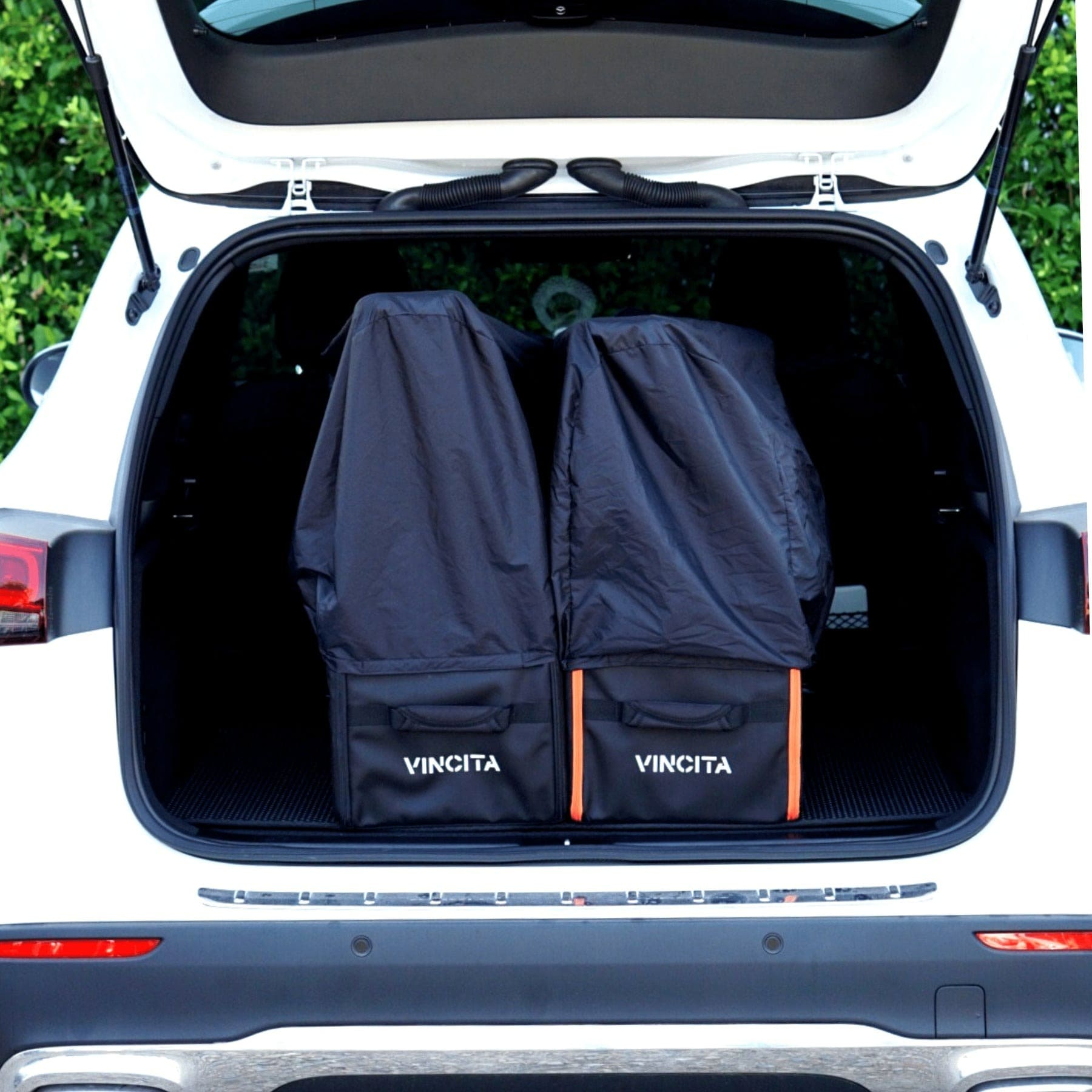 *耐用的內置提把,可承受任何折疊自行車的重量。提供可垂直放置的方式,以節省小型車輛的存儲空間,當車內無人看管時,附有一一體式的車罩可以防止自行車被盜。